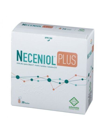 Original price was: $29.90.$26.91Current price is: $26.91.Add to cartNECENIOL PLUS 20 bustine è un integratore alimentare a base di acido alfa-lipoico a rilascio controllato (Matris), acetil-L-carnitina e coenzima Q10.
