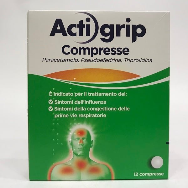 L’uso di Actigrip compresse deve essere evitato se si sta già utilizzando qualsiasi altro medicinale contenente paracetamolo. I soggetti che soffrono di alcolismo devono rivolgersi al proprio medico prima di assumere paracetamolo. I pazienti con malattie epatiche devono consultare il medico prima di assumere Actigrip. I pazienti con emicrania trattati con vasocostrittori alcaloidi ergotaminici devono consultare il medico prima di assumere Actigrip (vedere paragrafo 4.5). Nei pazienti trattati con paracetamolo, sono state riportate molto raramente gravi reazioni cutanee come pustolosi esantematica acuta generalizzata (PEAG), sindrome di Stevens-Johnson (SJS) e necrolisi epidermica tossica (TEN). I pazienti devono essere informati sui segni delle reazioni cutanee serie e l’uso deve essere interrotto ai primi segni di comparsa di rash cutaneo o qualsiasi altro segno di ipersensibilità. Nelle prime fasi della terapia i pazienti sembrano essere a piu alto rischio: l’insorgenza della reazione si verifica nella maggior parte dei casi nelle prime fasi del trattamento. Reazioni cutanee gravi come la pustolosi esantematica acuta e generalizzata (AGEP) sono state riportate molto raramente con prodotti contenenti pseudoefedrina. Questa eruzione pustolosa acuta può verificarsi entro i primi 2 giorni di trattamento, con febbre e numerose, piccole pustole, per lo più non follicolari, derivanti da un eritema edematoso molto diffuso e localizzate principalmente sulle pieghe cutanee, sul tronco e sugli arti superiori. I pazienti devono essere attentamente monitorati. Se si osservano segni e sintomi come formazione di numerose piccole pustole con o senza piressia o eritema, la somministrazione di ACTIGRIP deve essere interrotta (vedere paragrafo 4.8). Se la febbre persiste per più di tre giorni oppure se i sintomi non migliorano o ne compaiono altri entro cinque giorni oppure sono accompagnati da febbre elevata, esantema, quantità eccessiva di muco e tosse persistente, consultare il medico prima di continuare la somministrazione. Per la presenza di pseudoefedrina, i pazienti devono essere informati che il trattamento deve essere interrotto in caso insorgano: ipertensione, tachicardia, palpitazioni o aritmia cardiaca, nausea o eventuali segni neurologici (come comparsa o esacerbazione di mal di testa). Se si sviluppano improvviso dolore addominale, sanguinamento rettale o altri sintomi di colite ischemica (vedere paragrafo 4.8), la pseudoefedrina deve essere interrotta ed è necessario consultare un medico. Neuropatia ottica ischemica: Con la pseudoefedrina sono stati riportati casi di neuropatia ottica ischemica. La pseudoefedrina deve essere interrotta se dovesse verificarsi improvvisa perdita della vista o riduzione dell’acuità visiva, ad esempio in caso di scotoma. L’uso degli antistaminici può mascherare i primi segni di ototossicità di certi antibiotici. Ai pazienti con patologie respiratorie quali enfisema e bronchite cronica deve essere consigliato di consultare un medico prima di utilizzare triprolidina. Può causare sonnolenza (vedere paragrafo 4.8). La triprolidina può aumentare gli effetti sedativi di sostanze che deprimono il sistema nervoso centrale come alcol, sedativi, tranquillanti (vedere paragrafo 4.5). È necessario informare i pazienti che si deve evitare l’uso di bevande alcoliche durante il trattamento con Actigrip e che è opportuno consultare il medico prima di assumere Actigrip in concomitanza con medicinali che deprimono il sistema nervoso centrale.I pazienti con ridotta funzionalità renale non devono assumere Actigrip se non consigliato dal medico. Dosi elevate o prolungate del medicinale possono provocare un’epatopatia ad alto rischio e alterazioni a carico del rene e del sangue anche gravi. In caso di insufficienza renale ed epatocellulare utilizzare solo in caso di effettiva necessità e sotto il diretto controllo medico. Durante il trattamento con paracetamolo prima di assumere qualsiasi altro farmaco, controllare che non contenga lo stesso principio attivo, poiché se il paracetamolo è assunto in dosi elevate si possono verificare gravi reazioni avverse. Il sovradosaggio può portare a danno epatico. Ènecessaria pertanto un’attenta supervisione medica sia per gli adulti che per i bambini anche se non compaiono segni o sintomi evidenti. Invitare il paziente a contattare il medico prima di associare qualsiasi altro farmaco (vedere paragrafo 4.5). È sconsigliabile l’uso del medicinale se il paziente è in trattamento con farmaci antiinfiammatori. Popolazioni speciali: Consultare il medico per determinare la dose negli anziani per la loro maggiore sensibilità verso il farmaco.
