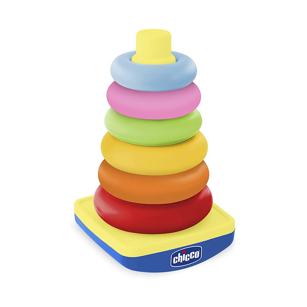 Una piramide colorata con 6 anelli di dimensioni differenti da infilare sulla base dal più grande al più piccolo. Afferrando e impilando gli anelli il bambino sviluppa la coordinazione e il movimento delle mani.