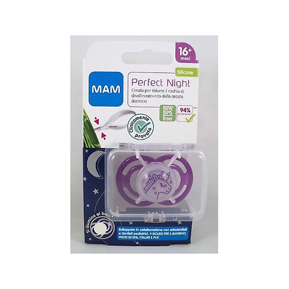 Mam Perfect Night è un succhietto in silicone che s’illumina e previene la malocclusione. Ideale per bambini di 16+ mesi.