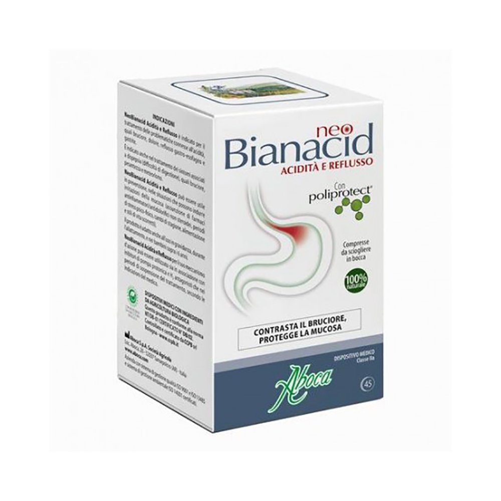 NeoBianacid Acidità e Reflusso è un prodotto a base di complessi molecolari vegetali e minerali, che svolge un’azione protettiva e lenitiva della mucosa gastro-esofagea, utile per contrastare rapidamente il bruciore, il dolore, la sensazione di acidità, ovvero i sintomi tipici dell’irritazione e dell’infiammazione della mucosa stessa.