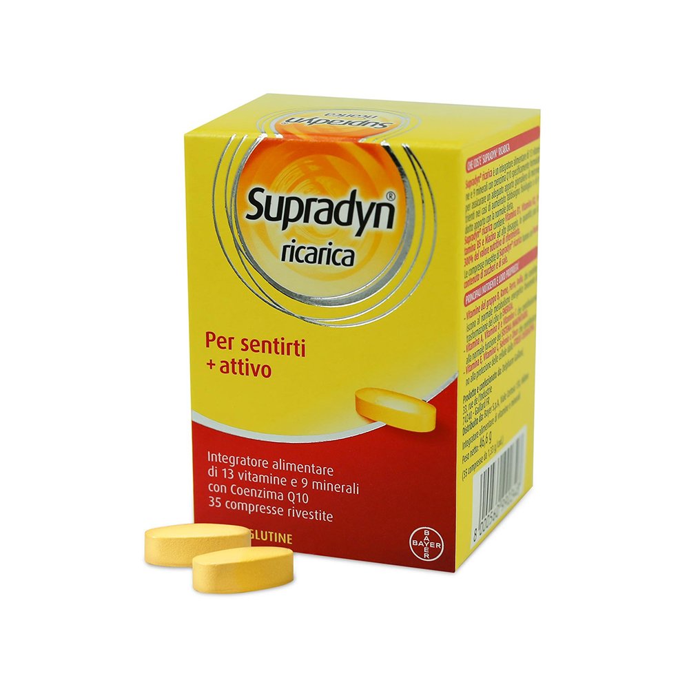 Supradyn® ricarica è un integratore alimentare in compresse a base di Vitamine e Minerali specificamente formulato per assicurare un adeguato apporto giornaliero di micronutrienti nei casi di aumentato fabbisogno fisiologico o di ridotto apporto con la normale dieta.
